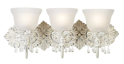 This antique chic bathroom light fixture is a fast and easy way to add charm to a bath or hall area. The hand-rubbed antique white finish is accented by glass droplets and frosted seedy glass.